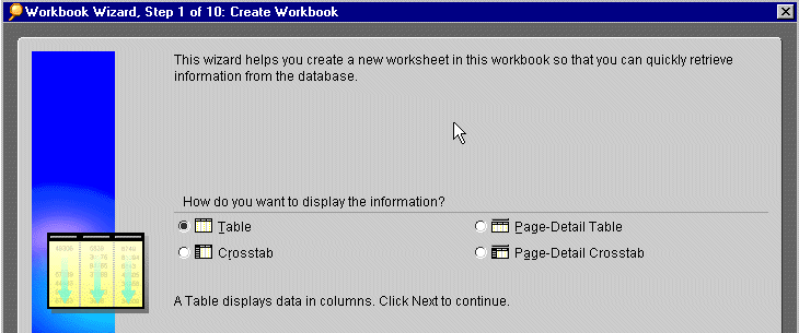 The Worksheet Wizard dialog appears. This dialog is where you select the layout--table or crosstab--that you want to use to display the data on the new worksheet.