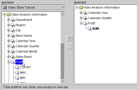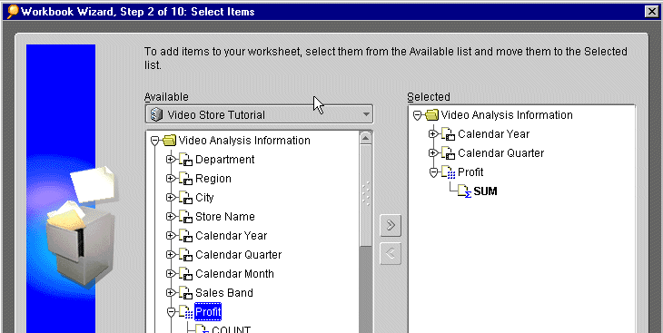 You can select data at various levels in the Available list. For example, selecting a folder and moving it to the Selected list, moves all the data within the folder to the list. Similarly, moving an item to the Selected list moves all values in it to the list and, ultimately, to the worksheet. For example, moving the City item to the Selected list results in the names of all the cities being on the worksheet.