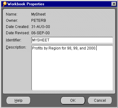 The Workbook Properties dialog box appears showing information about the Workbook. You can record additional information about the workbook in the Description box.
