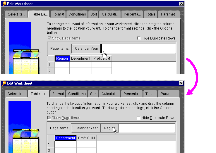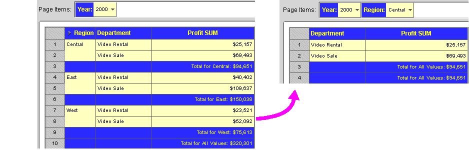 The following example shows what the worksheet looks like before and after pivoting the Region item to the page axis.