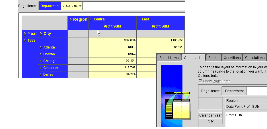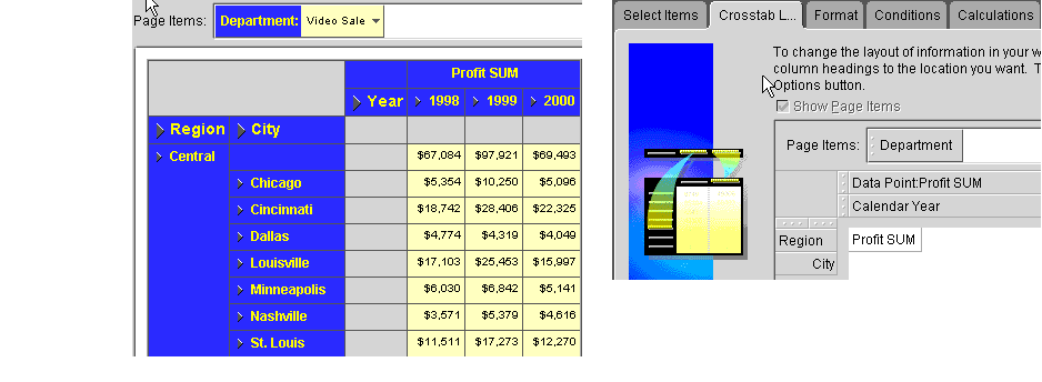 Because the data relationships on a crosstab depend on the intersection of the axis items, pivoting data from one axis to another creates a new set of data relationships. In addition, the new arrangement can add levels of data to an axis. For example, if the data on the side axis is for Region, pivoting the Year data item to the side axis add another level of data to that axis.