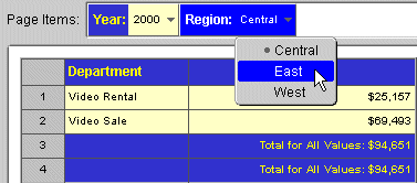Pivoting organizes your data by moving items from the main body of a table worksheet to the page axis. On a crosstab worksheet you have even more control over the elements you can pivot. For example, you can move data items from the main body of the crosstab worksheet to the page axis, side axis or top axis.