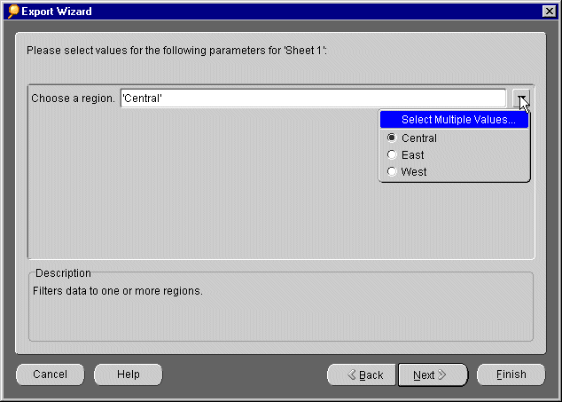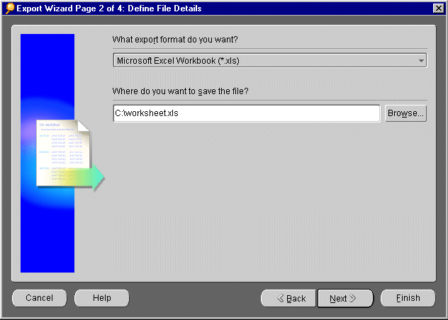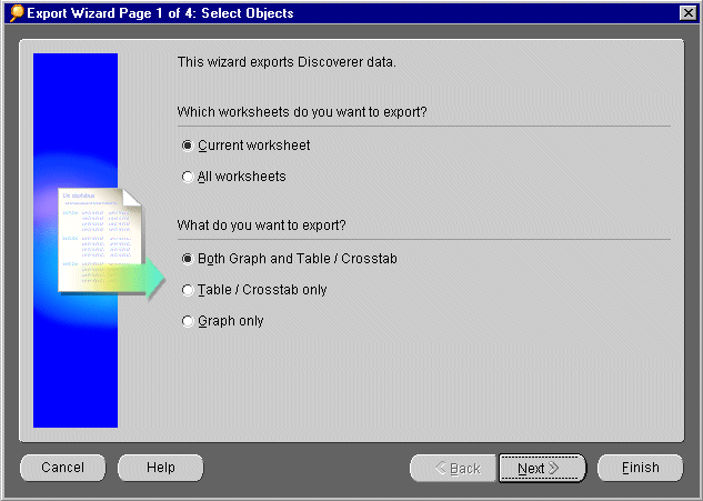 Discoverer provides the Export Wizard to help you share your worksheets and graphs with other people by exporting them to popular application formats, such as Microsoft Excel or HTML. In fact, because these two formats are so popular in the business world, Discoverer also provides shortcuts from the Toolbar and File menu to quickly export to Excel and HTML.