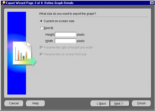 You can export a single worksheet, all worksheets in a workbook, and all graphs associated with any worksheets. Worksheets and their graphs export as separate files, one file for each worksheet in a workbook and one file for each graph. Note that the Export Wizard always exports graphs as GIF files, an image file format that is common on the Web and supported by many business applications. You can also choose to export graphs at different sizes. You can export the graph the same size that you see on screen or scale the graph larger or smaller.