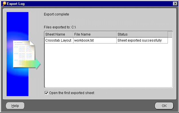 The worksheets are saved in the new format in the directory you specified. Progress messages appear to let you know how the export process is proceeding. The Export Log then appears so you can check that all worksheets were exported successfully.