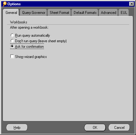 Ask for confirmation--This is the default selection. After the workbook opens, a dialog asks if you want to run the query for the first worksheet.