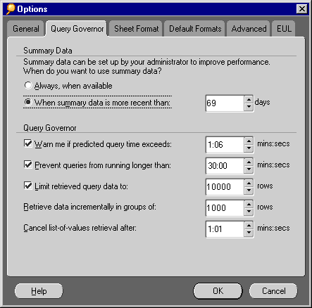 The Query Governor options help reduce the amount of time it takes to display data. You can set defaults for Summary Data and for Queries.