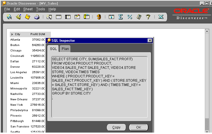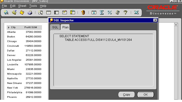 In the screenshot above, the worksheet contains the Items: City and Profit SUM. Although the Discoverer Administrator has created a Summary for these items, the SQL statement displayed in the SQL Inspector SQL tab does not indicate that a Summary, (in this case a Materialized View) is being used.