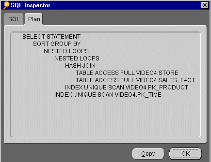 The Plan tab displays the Execution Plan chosen by the Oracle Server for the query request. The Execution Plan defines the sequence of operations that the Oracle Server performs to execute the SQL statement.